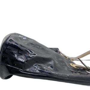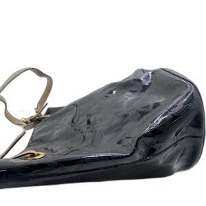 With a solid jet black exterior made of patent leather, this bag features a buckle and strap accent, gold-plated hardware, and a large Michael Kors logo throughout the bag. The bag has a snap closure, and features an adjustable shoulder strap with a 9-1/2" drop. The interior of the bag is lined with black fabric and includes inner pockets for added organization. This tote bag is perfect for travel, casual outings, or business meetings, and its large size and multiple compartments make it a versatile addition to any wardrobe.