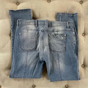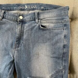 These are absolutely my favorite teams but unfortunately they no longer fit. MiH Jeans  Paris, roadster, mid rise, slim leg (definitely not skinny though, at least on me) Jen in Whistler wash. These are also described as cropped but they are not cropped on me at 5‘6“ tall. Please double check measurements. 98% cotton 2% elastin. Laying flat measures 17 inches straight across the waist with a 9 inch rise and 28.5 inch inseam. Angular seams on the leg in the front and straight down the back center of each leg, makes for nice detail
