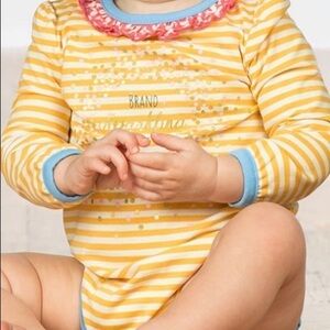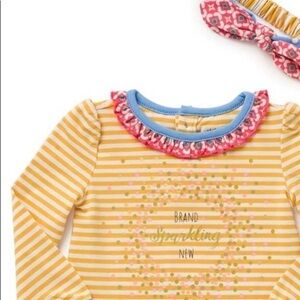 Matilda Jane. New with tags, in package. Hello baby bodysuit set. Yellow/white stripe with blue trim bodysuit. Long sleeve. Ruffle collar. Set includes a matching headband with cute bow. 2+ items discounted.
