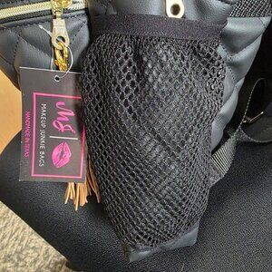 Makeup Junkie Quilted Onyx Academic Size Backpack. One of a kind - custom ordered. Beautiful leopard interior. Front zipped pocked with leopard interior. size mesh pockets to hold water bottles, etc. Back strap to attached to your suitcase handle. Interior feature large slip pocket to hold your laptop or tablet. Made in Texas with lifetime warranty. 18x14x5