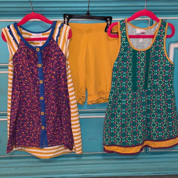 Both tops are size 10. Shorties size 12.