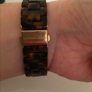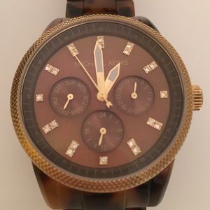 MK 5038 tortoise jet set watch. Comes with box, pillow, booklet and additional links. Swarovski crystal accents on dial. Some scratches on underside latch (see photo), otherwise excellent condition. Needs new battery. Classic and beautiful timepiece.
