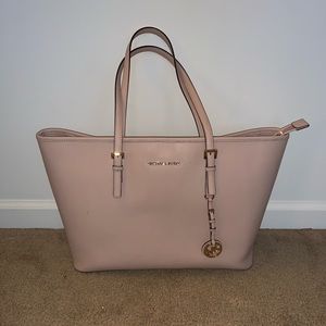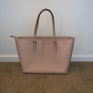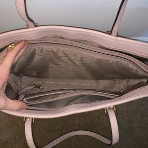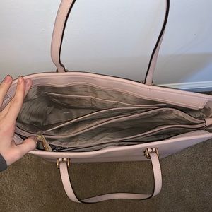 I used this bag for only a few months for school. It hold so much and the straps are comfortable on your arm or shoulder. Light pink color with gold hardware. It has a center zipper part that has some padding for a laptop. My laptop is 14 inches and it fits in there with room to spare. This bag is the type of leather that won’t bend in the center or on the edges.