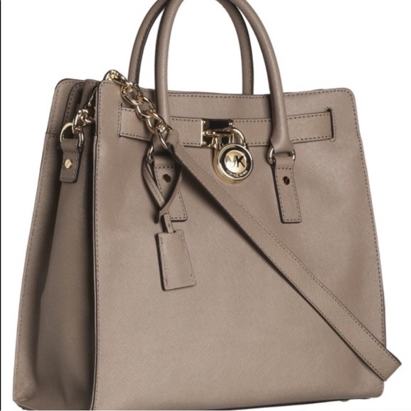 This saffiano leather handbag is in the color dune. It has been gently used a handful of times. There are a few minor stains that are very hard to see with the naked eye. All of the hardware is gold. If you have any questions feel free to ask!
