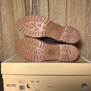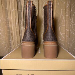 Elevate your style with these Michael Kors Corey MK combat boots. The brown logo-print canvas/leather upper material paired with a round toe shape and zip closure gives a sleek and modern appearance. These boots are versatile and perfect for any occasion, whether it's for travel, activewear, casual, workwear, or business. The leather outsole material ensures durability and comfort for all-day wear. The boots are a size 7 and come from the Michael Kors Logo product line. Add these stylish boots to your wardrobe today!