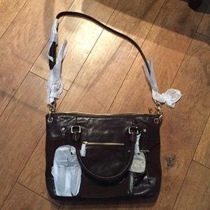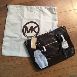 Brand new, coffee color, Michael Kors purse. Genuine leather, tag still attached, paper wrappings still on buckles, and MK logo!!! Comes with bag to put purse in
