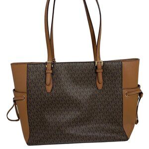 This elegant MK Michael Kors Gilly tote is perfect for travel, featuring a stylish brown color, drawstring top, and zip closure. Ideal for carrying essentials in style.