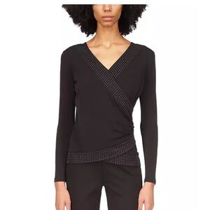 The surplice neckline and faux-wrap hem of this petite jersey top from MICHAEL Michael Kors glow with a rhinestone-studded trim.