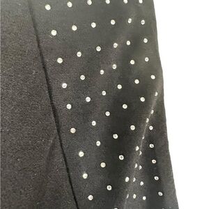 Rhinestone micro-studs at neckline and hem; faux-wrap hem