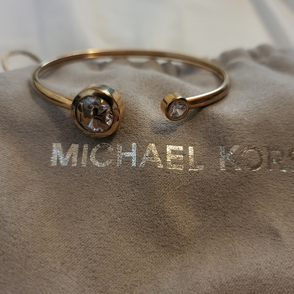 MK bangle. approximately 2.4 inches across so it is very small, for smaller wrists. gently used with 0 tarnishing and minimal surface scratches noted. very cute and versatile! comes with small dust bag