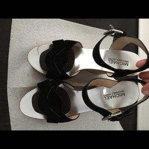 Beautiful MK 4in wedge with rubberized bottom and black suede upper. Bought with a scratch across the silver ball of foot on right foot. Worn once and even put in brand new/never used ball of foot pads for extra comfort!!!! Cleaning out my tall heels I️ don’t wear and these are a beautiful pair I️ wish I️ had more reasons to wear.