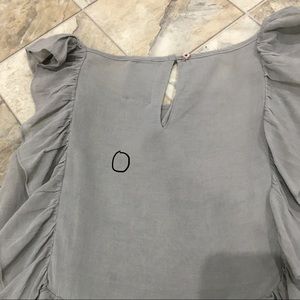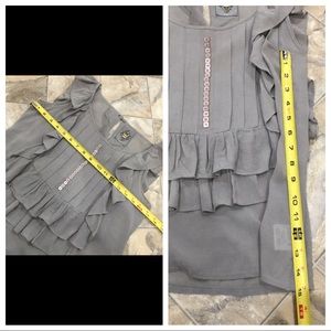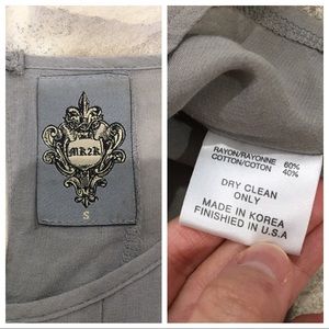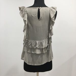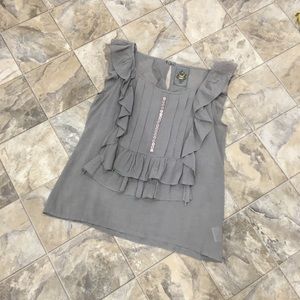 MK2K Sage Green Sleeveless Blouse | ruffles on front | buttons in the back at the neck with a keyhole opening | decorative buttons on front | 60% rayon, 40% Cotton | size S | inseam is 15” | length across chest is 17” | has a tiny mark on front and back as shown in pics - not noticeable when worn