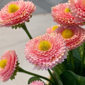 Always in bloom, this arrangement of everlasting pink English daises stands in a distinctive metal basket, decorated with Courtly Stripe,