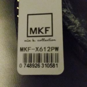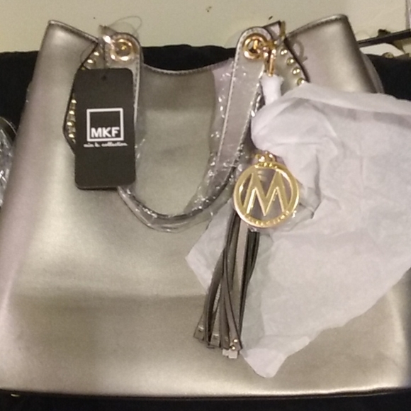 Brand new with tags. Never used. Silver with gold accents. MKF tassel. Three outside zippered sections. Inside has one zipper pocket as well two side pockets for cell phone etc.