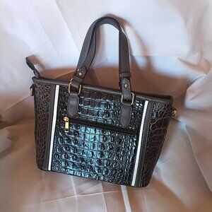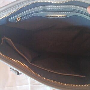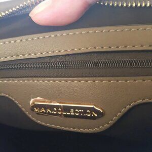 new. never used. matching wallet. detachable shoulder strap. has metal feet on bottom. 13 x 9.5 x 4"