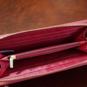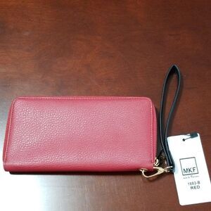 Pretty red leather wallet by Mia k Farrow. It is NWT. It has 12 card slot, 2 pockets, and zipper change pocket.