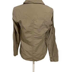 Khaki button down outside top two patch front pockets and side zippered pocket.