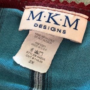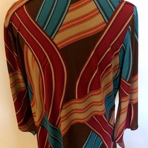 Beautiful Women's V-Neck Multicolor Asymmetrical Top. MKM Designs SZ 2X. The sleeves and the bottom are angled. 92% polyester and 8% spandex is in very good condition.