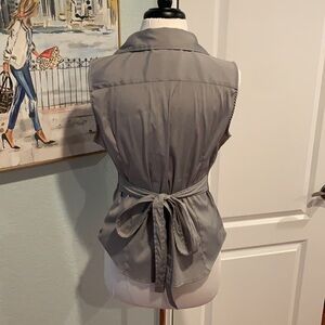 Pre-loved in excellent condition, super cute and sexy sleeveless blouse with cumber bun waist and tie in back or front! Color is silver gray. Sz L, but seems to run small. Please check measurements in pictures for a proper fit:)