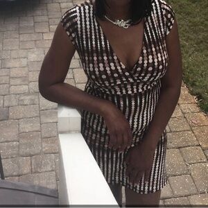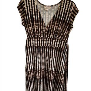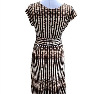 Ladies pull over dress. Tan and beige with sewn in belt that could be worn tied in the front, side or back. Is a fitted dress, v neck in the front, sleeveless. A true size small bust 28”, waist 31”, hip 38”, 29” length. I wish I had gotten a better picture of this dress, it is so cute, I just can’t take it out of my closet. Some hottie needs to snatch this!