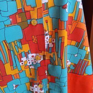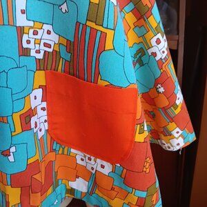 This 1960s vibrant shirt dress showcases bold abstract patterns in turquoise, orange, and yellow hues. Featuring short sleeves, a button-up front, and a single front pocket, it embodies vintage charm and retro elegance. Ideal for collectors or those seeking unique statement pieces.