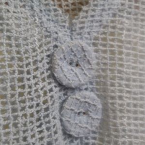 Gorgeous open knit cover-up tank w/ longer flowy shark hem sides. Glittery w/ the scattered pale blue sequins sewn into the soft thread-could be cott/poly. Cute covered buttons w/ inverted pleat going down front from 2nd one:) Versatile as a blouse w/ long tank or slip underneath, or a tee or t-shirt dress underneath for a jumper look, or pretty swim🏊cover-up🌊 22 in across bust w/ even more stretch in yarn😛..