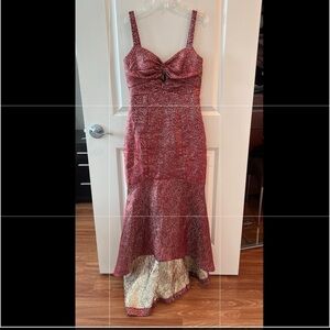 Fitted metallic jacquard gown styled with a sweetheart neckline, high- low hem and contrast lining. Sweetheart neckline Sleeveless
