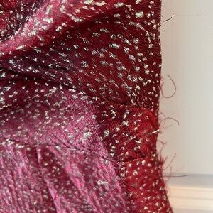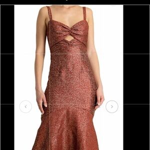 High-low jacquard midi dress with knotted bodice and cutout detailing. Metallic terracotta and gold jacquard fabric. Waist seam and hidden center-back zipper.