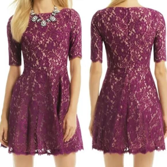 ML Monique Lhuillier Floral Lace Fit & Flare Mini Dress Lined Magenta Women's 14