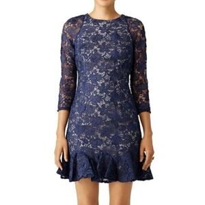 This ruffled flounce blue lace sheath dress from Monique Lhuillier features a navy blue hue with semi-sheer 3/4 raglan sleeves, illusion guipure lace, a rounded neckline, fitted sheath silhouette, and a ruffled flounce hem. It is fully lined and impeccably made.