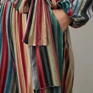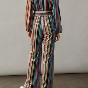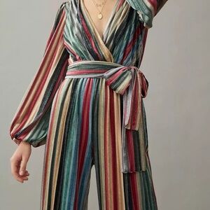 With colorful stripes and a sleek velvet finish, this stunning jumpsuit is a wardrobe essential.