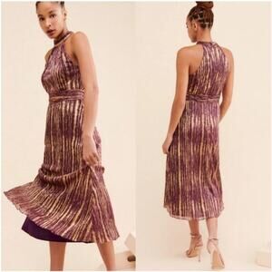 ML Monique Lhuillier Metallic Pleated Halter Midi Cocktail Dress Purple Gold 2