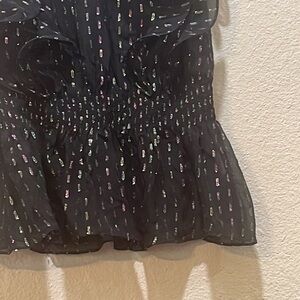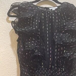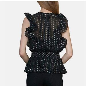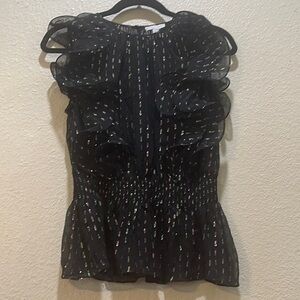 ML Monique Lhuillier top with metallic detail and ruffle trim.