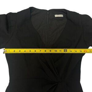 This elegant black floor length ML Monique Lhuillier dress features a stylish v-neck and ruffle detail. Ideal for evening events, its puff sleeves add a touch of sophistication.
