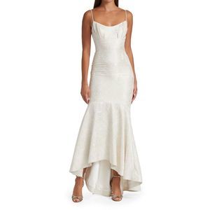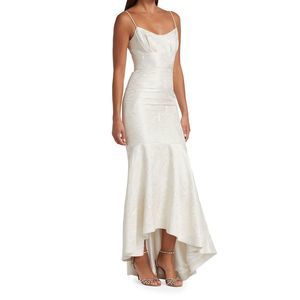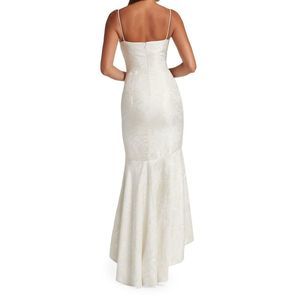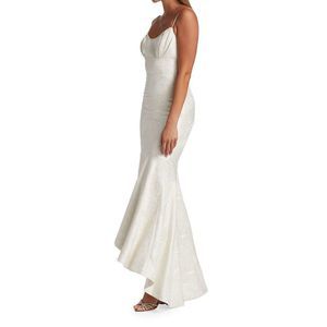 Jacquard gown with delicate beaded faux pearl straps and high-low hem.