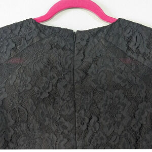 ML Monique Lhuillier beautifully crafts a bodice and sleeves in floral lace on this ebony cocktail dress.