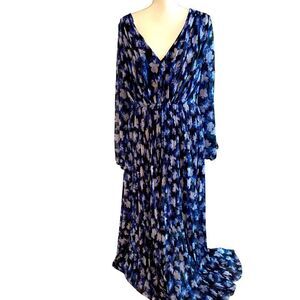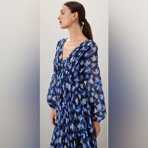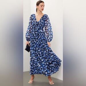 Glide into your next event with peak main character energy in this flowy floral dress by ML Monique Lhuillier. Showcase the sultry plunging neckline with delicate layered necklaces to finish this pretty outfit.