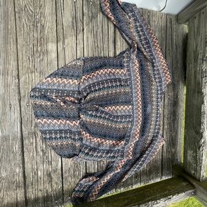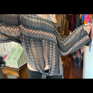 Model is normally size small so it fits loosely, but also looks great! Comfy top with tie Intricate patterns Size M-L