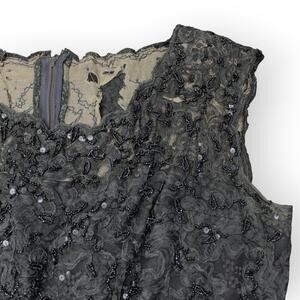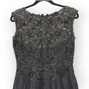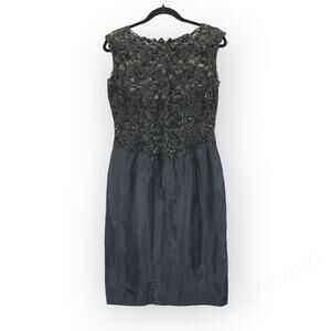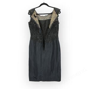 knee-length - sleeveless - black lace, sequin, beading overlay top - smooth taffeta bottom is lined - sheath silhouette - back zipper closure
