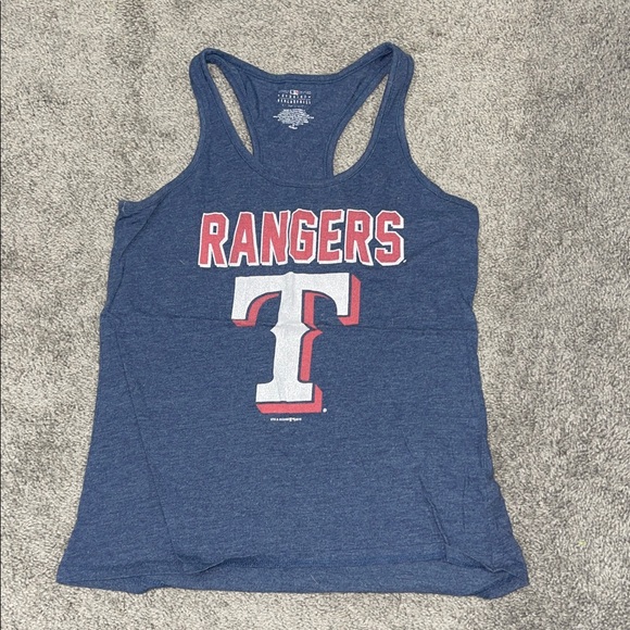 Stylish blue muscle tee. Features bold Rangers logo. Comfortable and sporty.