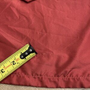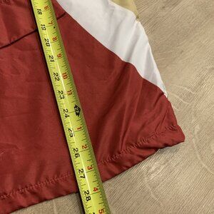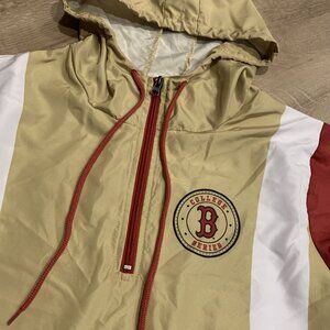 Stylish MLB windbreaker. Features red and tan color blocks. Hooded design with front pocket. Perfect for casual wear.