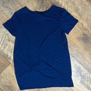 Navy blue tee with Boston Red Sox logo on the front. Features twist-front style to look super cute untucked. Comfortable and stylish for lady fans. Appears to have never been worn or washed. 65% Polyester/35% Rayon. 18” P2P, 27” from nape to bottom of curved hem.