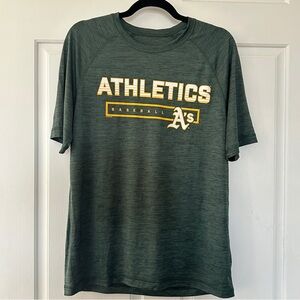 Size Men’s Medium. Features a moisture-wicking, athletic fit perfect for workouts, game days, or everyday wear. Dark green heathered fabric with bold gold and white “ATHLETICS” graphic across the chest and “BASEBALL A’s” below. Lightweight and breathable with a soft performance feel.
