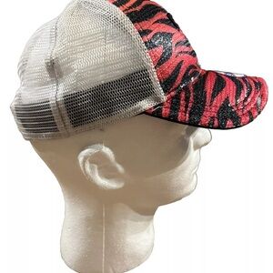 Stylish zebra print cap. Features bold red and black colors. Perfect for youth fashion.
