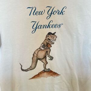 MLB & Tiny Turnip collaboration for the New York Yankees. Features a T-Rex ready to throw the first pitch of the ballgame. MLB merchandise tag still attached, this shirt is new with tags. It does have slight markings on the back photographed for disclosure, I didn’t try to personally wash it or spot treat it since the tag is still on! Will come steam cleaned and as is. White base, 100% cotton, lightweight and breathable material.