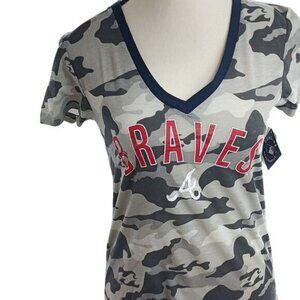 MLB Womens Atlanta Braves Camo V Neck Short Sleeve T Shirt Baseball Tee