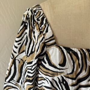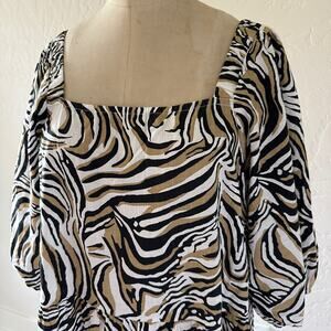 This casual, lightweight dress from Mlle Gabrielle will take you from lunchtime to date night. Darling square neckline, puff sleeve & smocked back detail in an animal print.