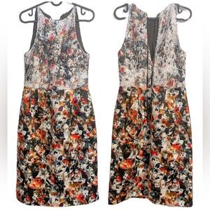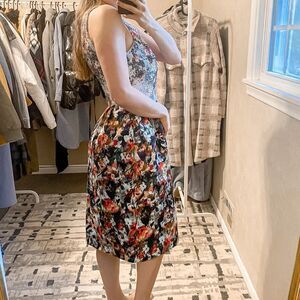 Features: sleeveless, back zip and self-tie closure, side pockets, sequin bodice, pencil skirt, below knee length, fully lined, abstract watercolor pattern