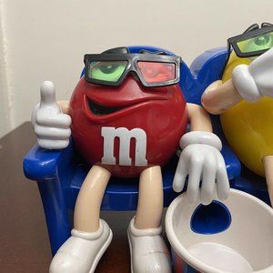 M&M Candy Dispenser "At the Movies" 3D Movie Theater Seats Admit One Collection. Collectible M&M Candy Dispenser3-D Movie Theater SeatsCharacters are wearing multi color 3-D glasses Candy dispenses into a "popcorn" bucketDispenser measures 8-1/2" x 7" x 7" high