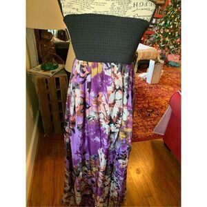 MM Couture By Miss Me Purple Floral 100% Silk Strapless A Line Maxi Dress Women S. Beautiful soft lined dress. Very Good Used Condition.